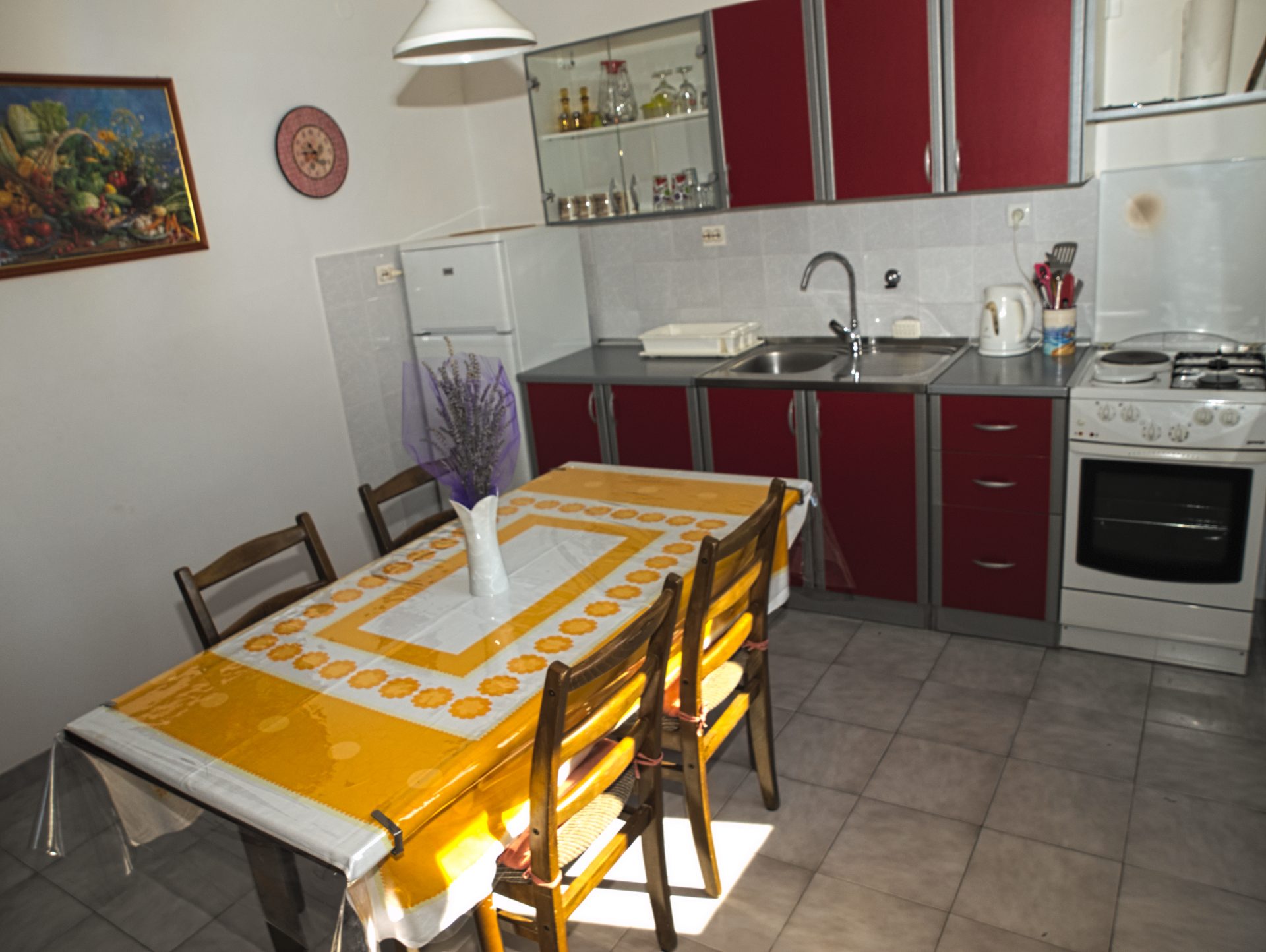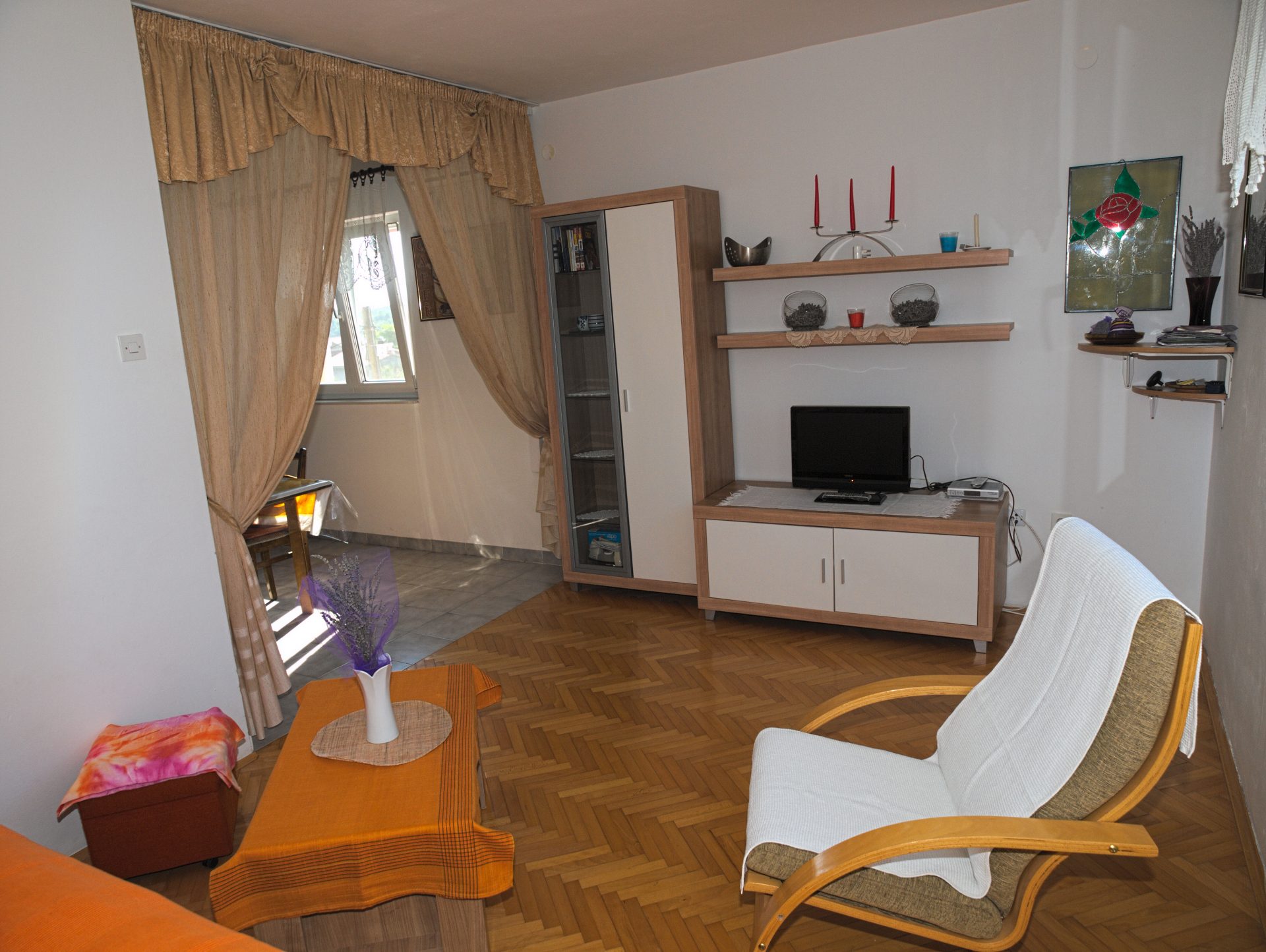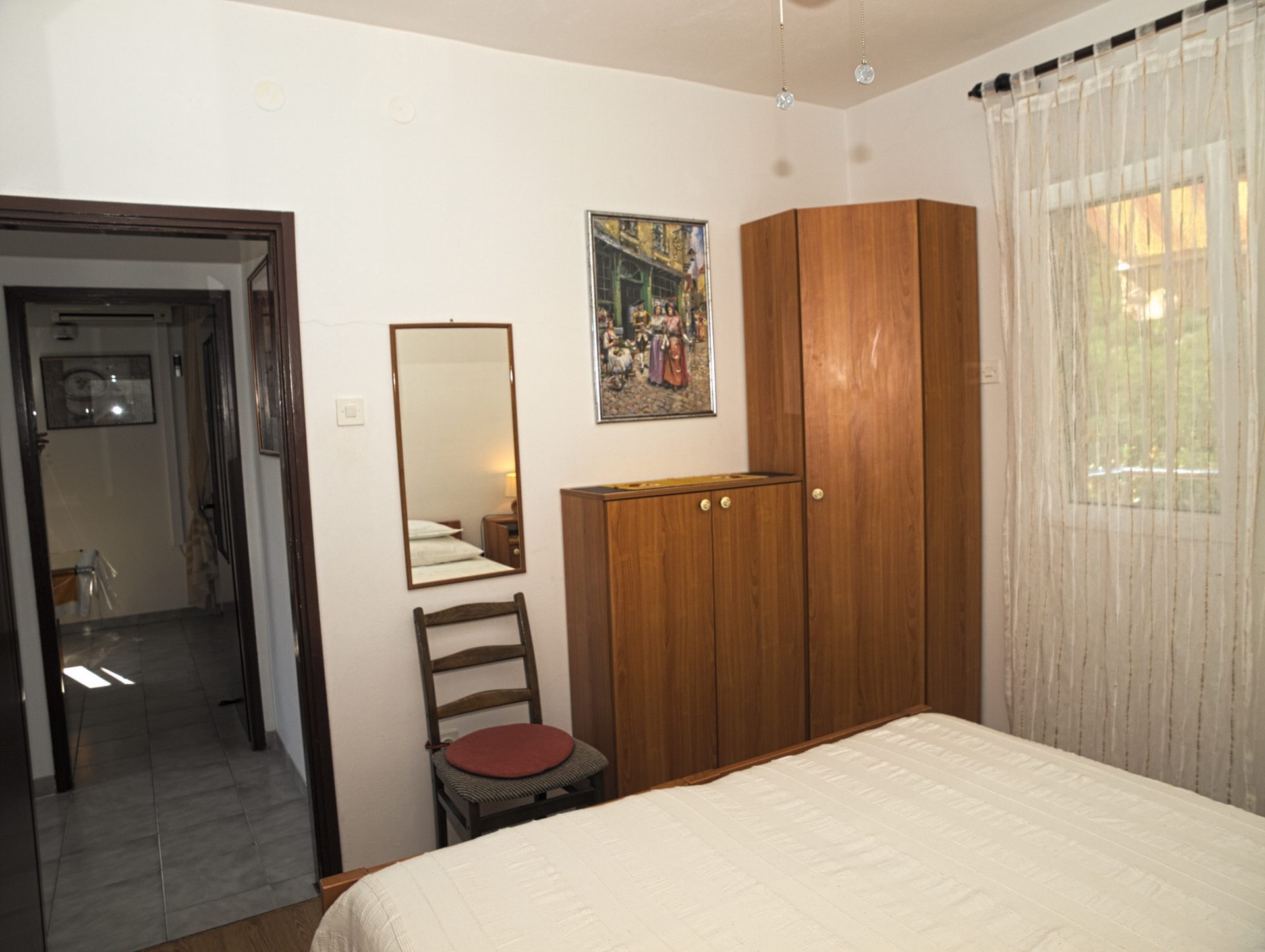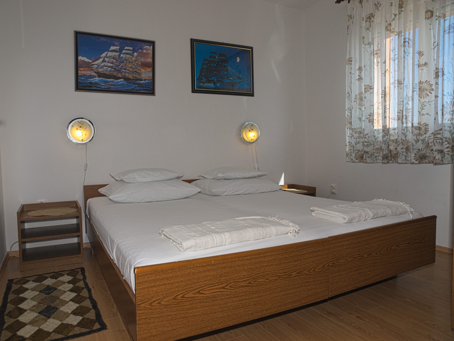 - Jedan dvosobni apartman na katu obiteljske kuće sa dvije velike terase, jedna je s pogledom na more, a druga s pogledom na vrt i maslinjak. Ima kuhinju i veliki dnevni boravak, kupatilo sa wc-om i posebni wc. Ima sat tv, klima uredjaj i wi fi. Parkiralište je uz kuću. Roštilj u vrtu. Do betinske pošljunčane plaže je 2 minute hoda ili 150 metara.